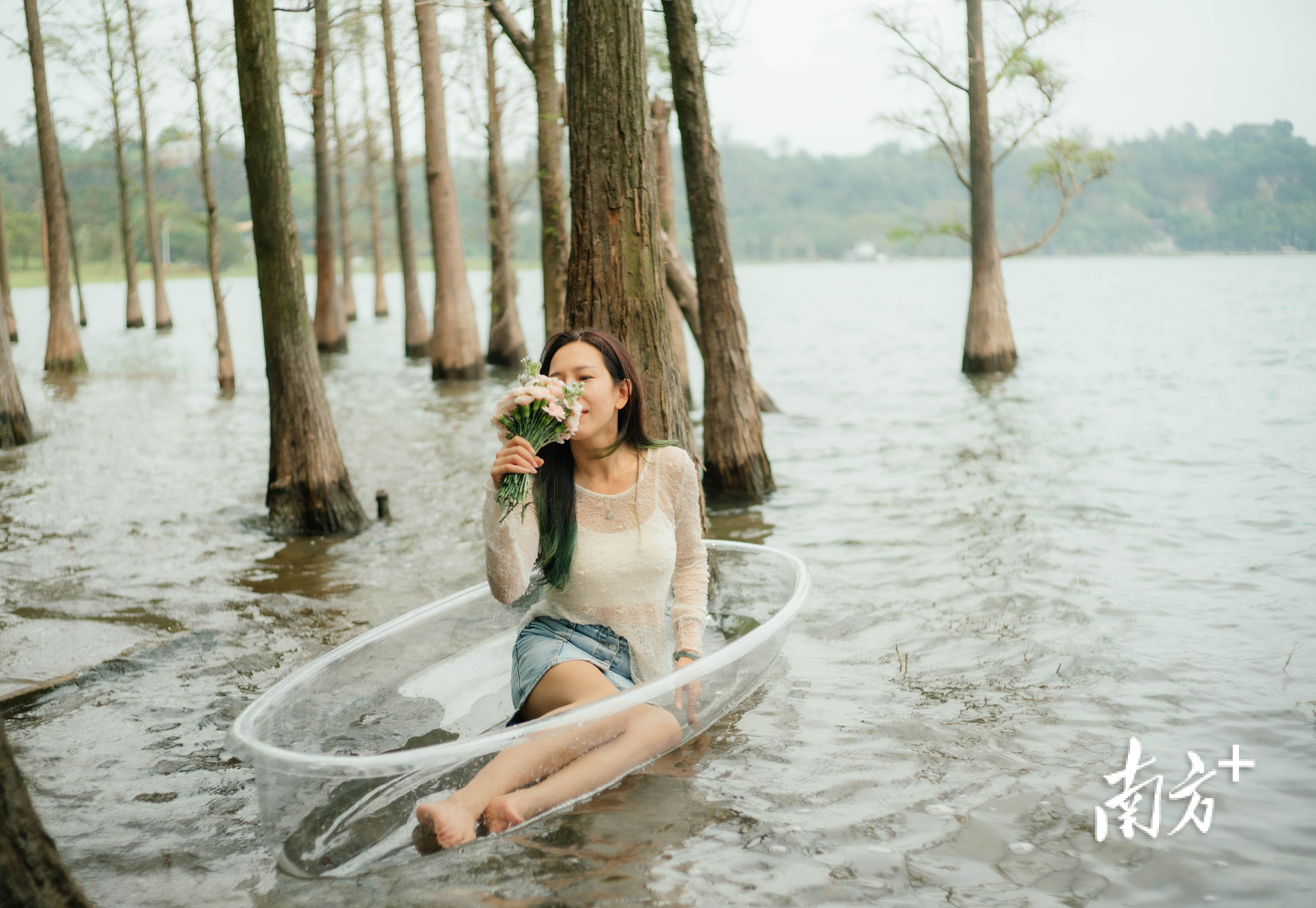 恰逢第57个世界地球日,这处场景完美践行了“人与自然和谐共生”的理念——全程不做过度人工造景,最大化保留落羽杉林“水杉共生、临水而立”的原生景观,将透明玻璃船设置在杉林浅水区,让船身与湖水、杉树、玛珥湖全景形成天然画框,实现了“人在船中坐,船在画中游”的意境。