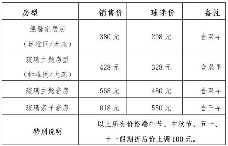 10月1日-10月5日商务房/大床房 498元/间(含早),球迷优惠价458元/间(含早);亲子房798元/间(含早),球迷优惠价 628 元/间(含早)。