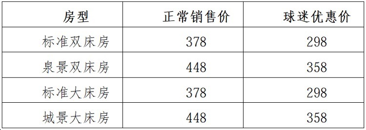 住宿优惠价格:深睡客房398元/间(含早),球迷优惠价280元/间(含早);智能客房428元/间(含早),球迷优惠价350元/间(含早)。