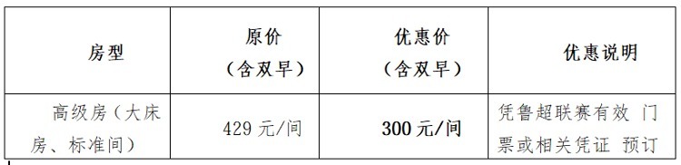住宿优惠价格:商务客房420元/间(含早),球迷优惠价330元/间(含早);行政客房480元/间(含早),球迷优惠价380元/间(含早)。